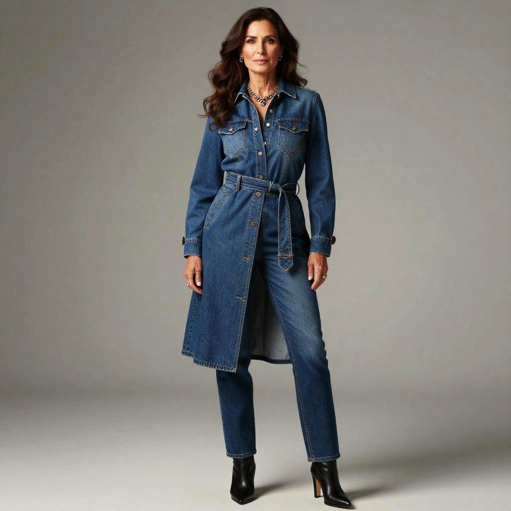 A confident woman models a contemporary denim outfit featuring a belted denim shirt dress layered over matching denim jeans. Styled with loose waves and black heeled boots, the look combines classic denim elements with modern fashion sensibility.