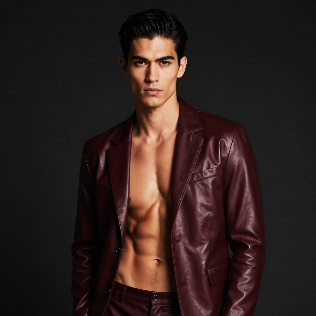 A confident young man models a sleek burgundy leather suit with no shirt underneath, highlighting his toned physique. The dark background enhances the modern, edgy style of this high-fashion portrait.