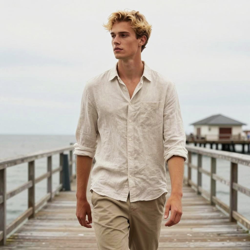 A young man with blonde hair styled in a casual, slightly tousled look walks on a wooden pier by the sea, dressed in a light beige linen shirt and khaki pants. The overcast sky and muted tones create a relaxed, natural atmosphere reflective of modern minimalist fashion trends popular with Gen Z.