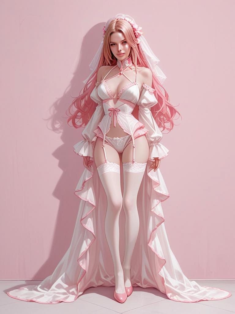 A realistic full-body portrait of a woman dressed in elegant, sheer pink and white boudoir lingerie with stockings and a flowing train. The composition highlights her soft pink hair and delicate, intricate details of the lingerie, set against a matching pink background in a styled, high-definition aesthetic.