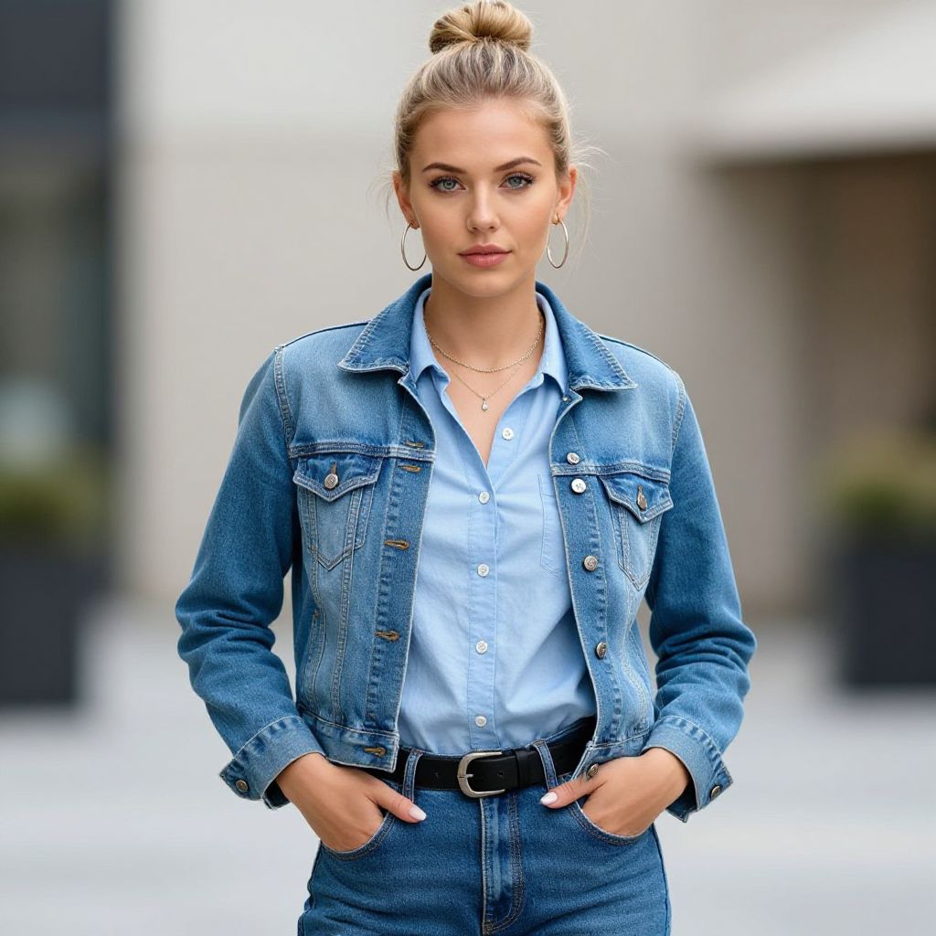 A confident young woman stands outdoors dressed in a casual denim jacket and matching jeans, paired with a light blue shirt and black belt. Her hair is styled in a neat bun, and she accessorizes with hoop earrings and delicate necklaces, exuding a modern and approachable style.