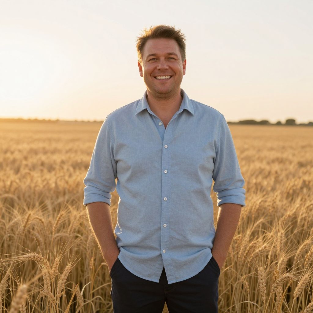 A smiling man stands confidently in a sunlit wheat field during golden hour, wearing a light blue button-up shirt with rolled-up sleeves and dark pants. The warm lighting and natural setting evoke a sense of calm and contentment.