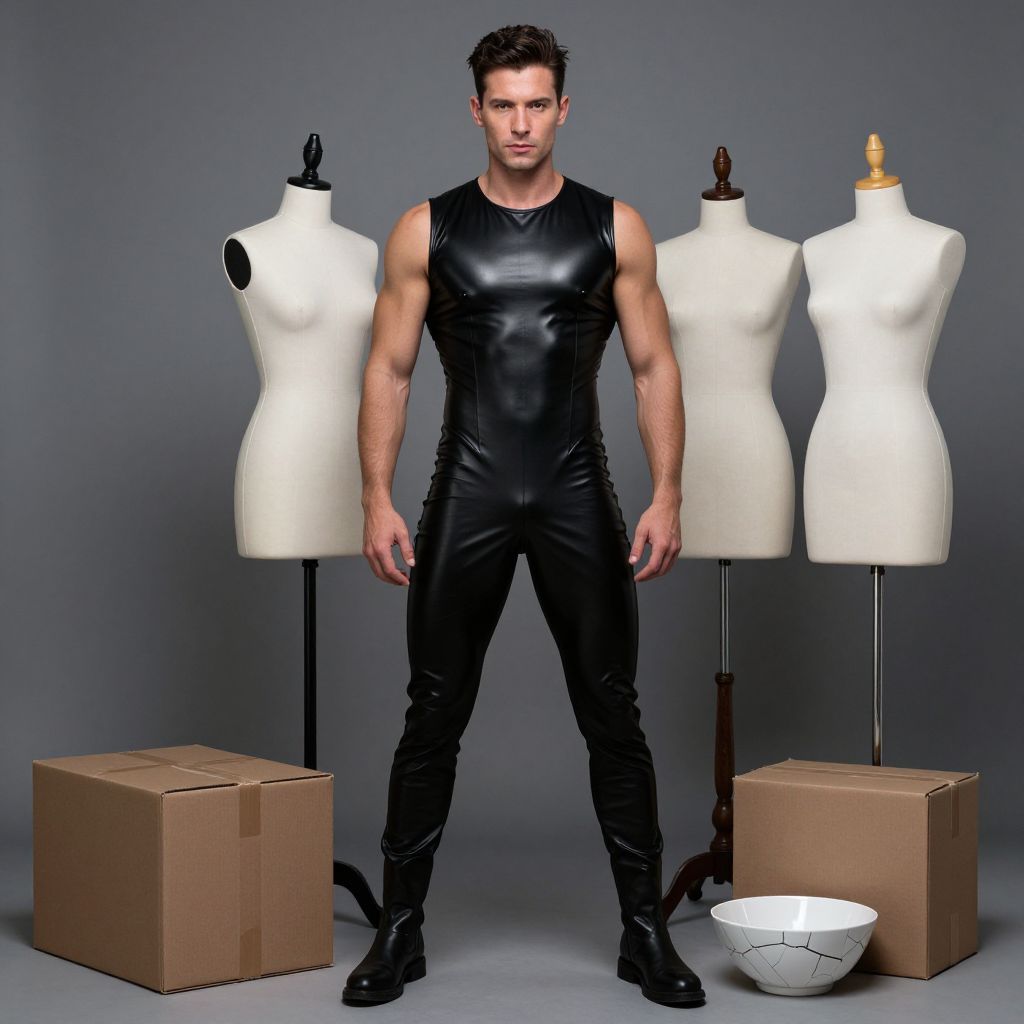 A confident man wearing a sleek black leather jumpsuit stands firmly in a studio setting, flanked by three neutral-toned dress mannequins and two cardboard boxes. The modern fashion composition highlights a bold and edgy style, contrasted with minimalist elements and a cracked white ceramic bowl placed on the floor.