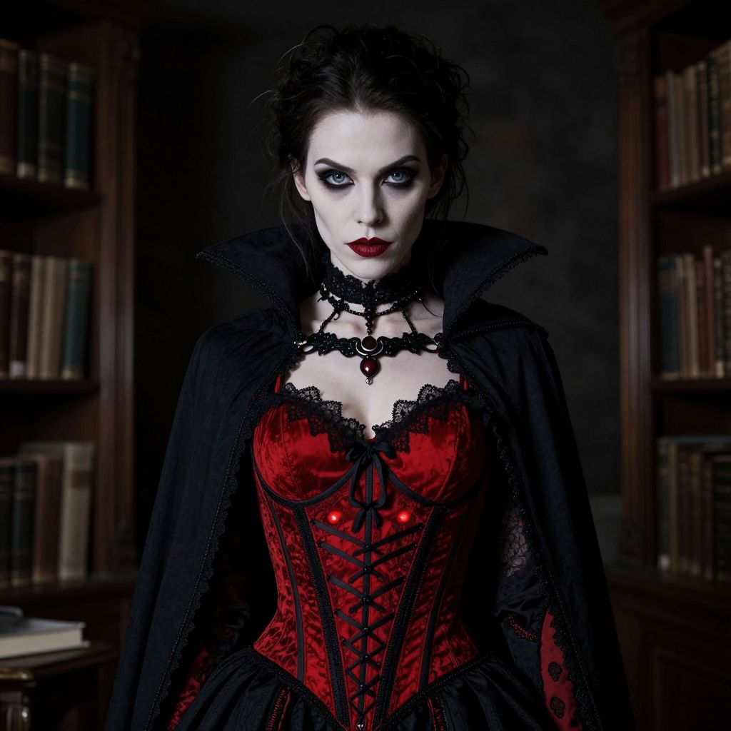 A woman dressed in a dramatic gothic vampire costume poses in a dark library. She wears a striking red corset with black lace details, complemented by a high-collared black cape and intense dark makeup, enhancing her pale complexion and piercing gaze.