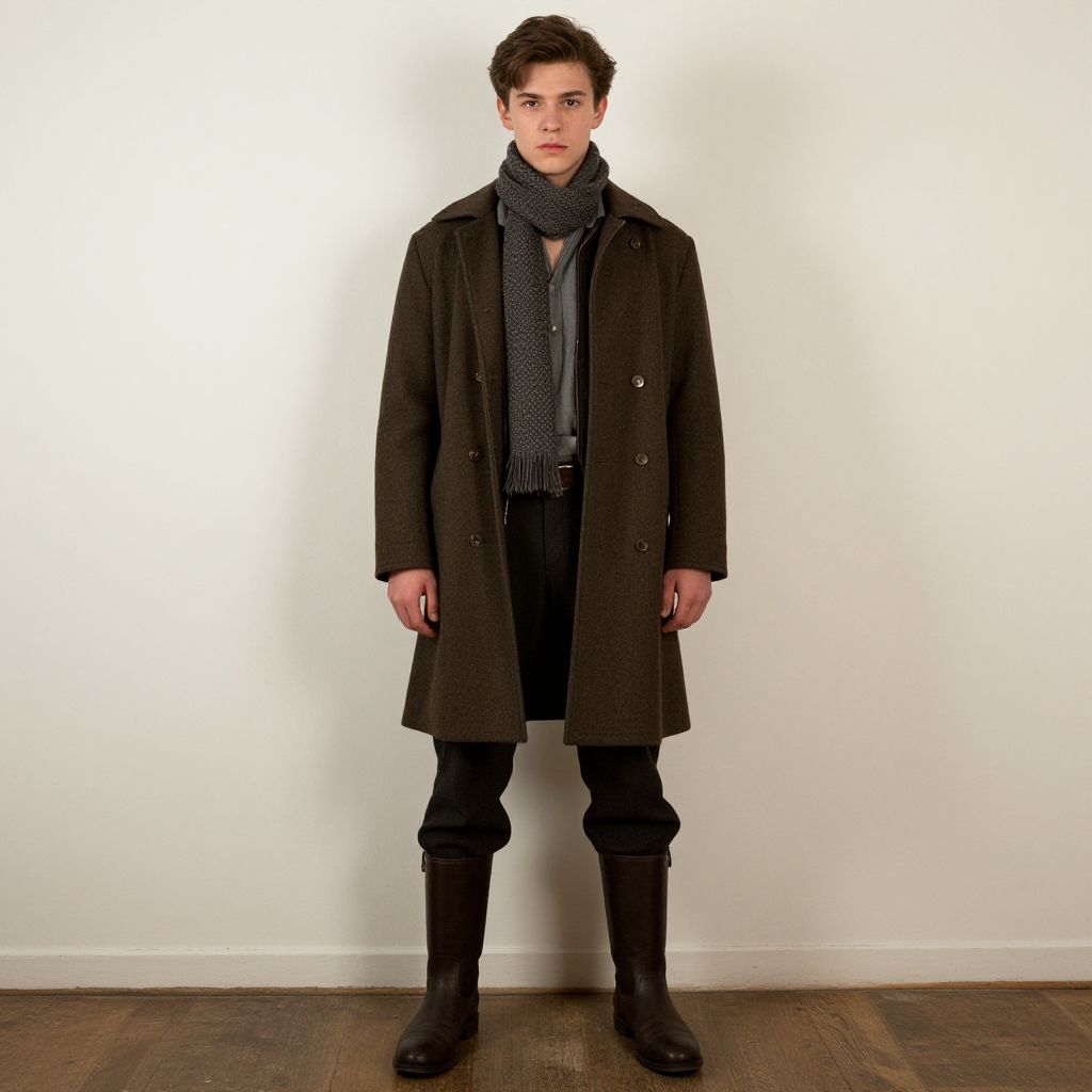 Young Man in Classic Brown Winter Coat with Scarf and Boots