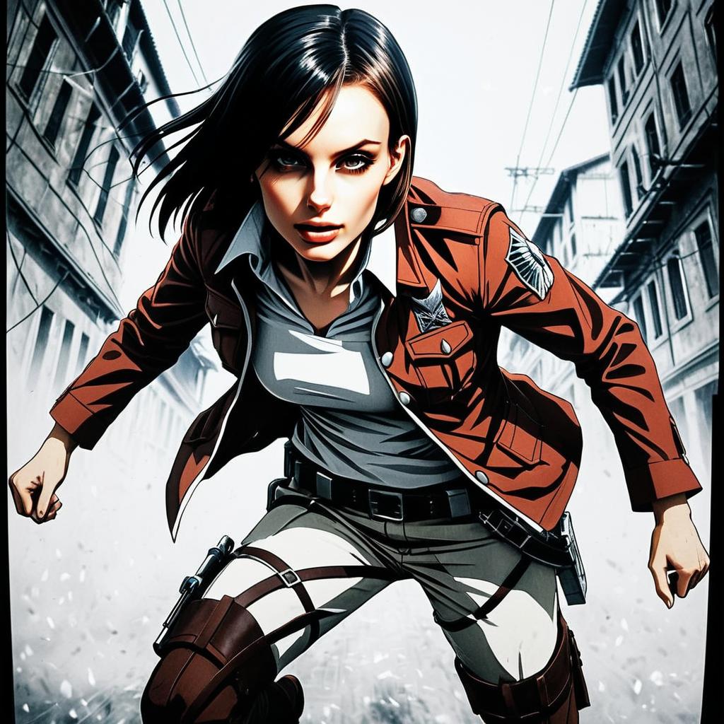 This dynamic digital illustration features a determined woman in a tactical outfit, poised in an action-ready stance amidst an urban setting. The character wears a distinctive brown jacket adorned with emblematic patches and harness gear, highlighted by a dramatic, stylized anime art style reminiscent of popular action manga and anime series.