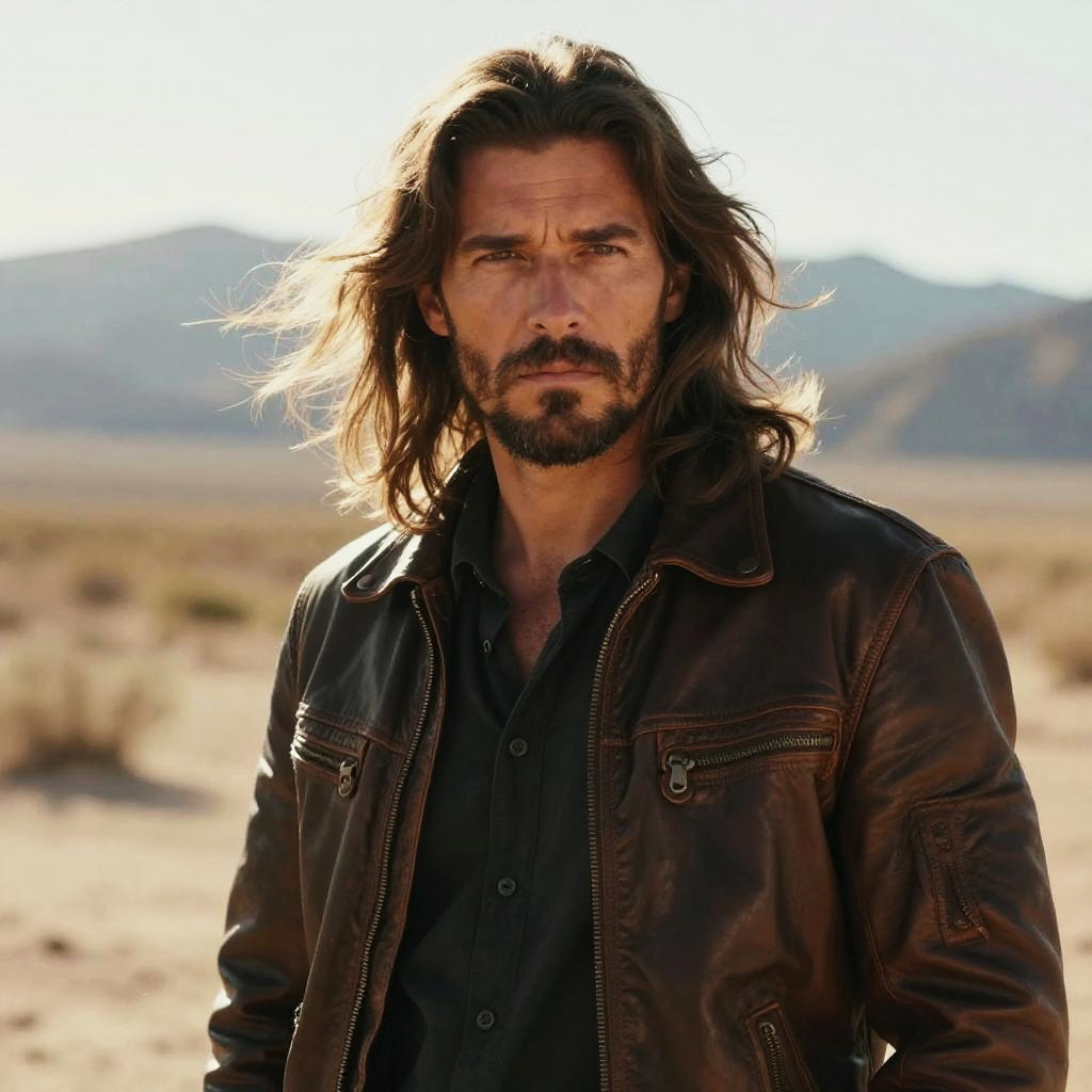 A rugged man with long hair and a beard stands confidently in a desert landscape, wearing a vintage-style brown leather jacket over a dark shirt. The warm sunlight highlights his intense expression, evoking a sense of adventure and resilience.
