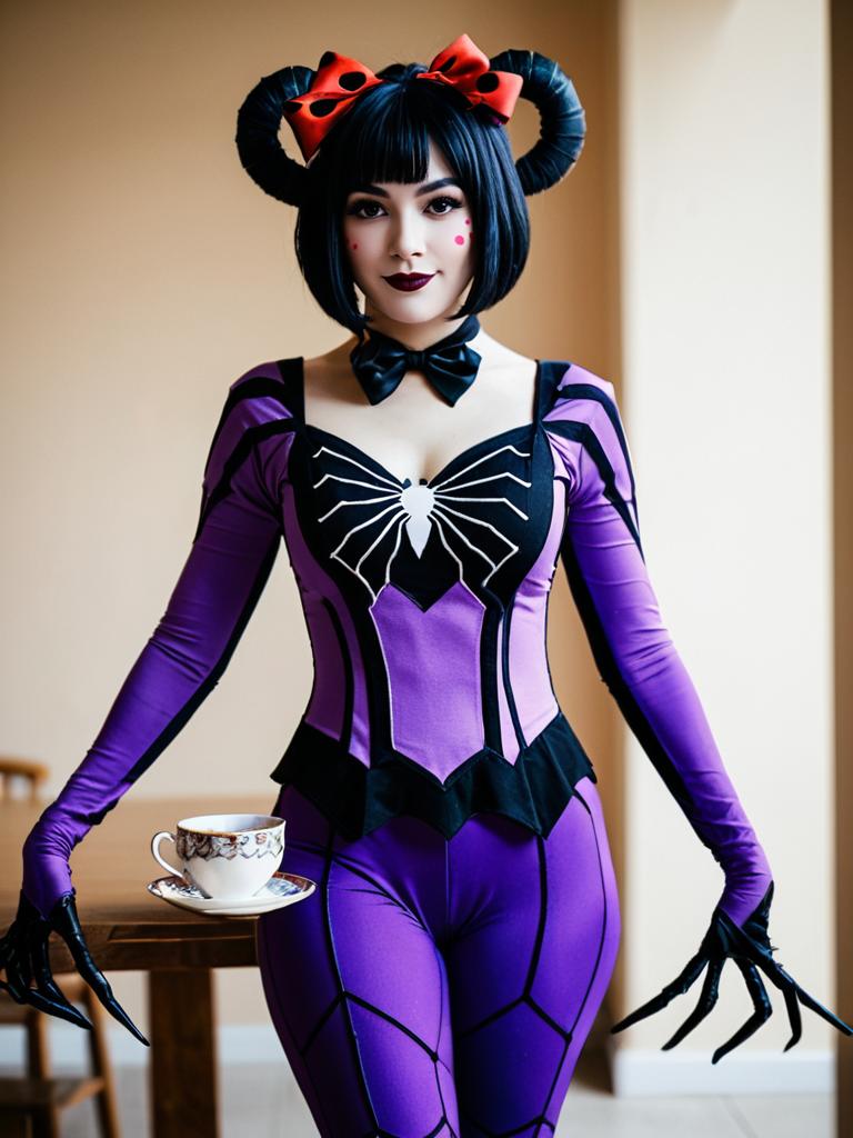 Muffet Cosplay in Purple Spider-Themed Outfit Holding Teacup