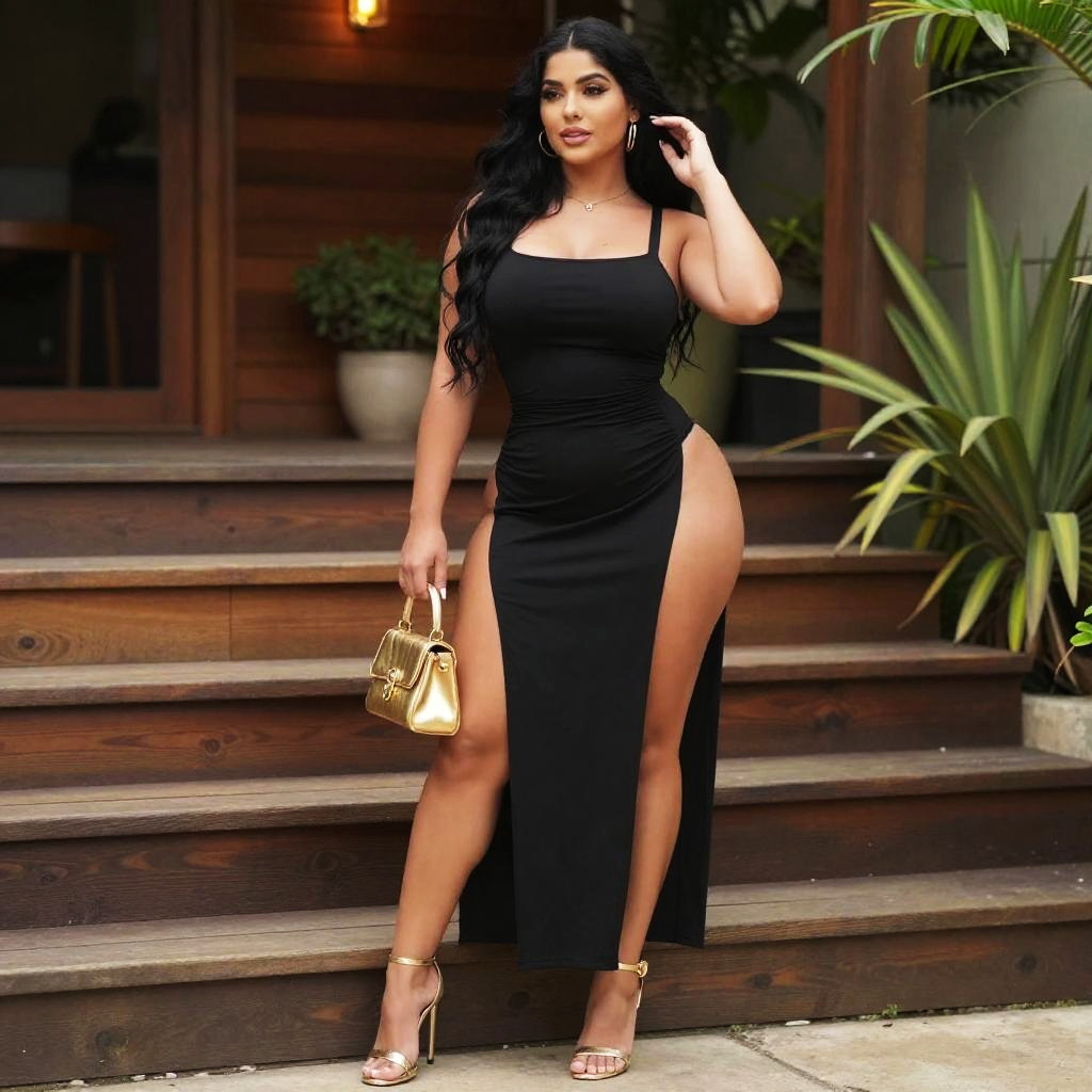 A confident woman poses in a stylish black dress with an ultra-high side slit, complemented by gold high-heeled sandals and a matching gold handbag. The image captures an elegant yet bold fashion statement in an outdoor setting with wooden steps and lush greenery in the background.
