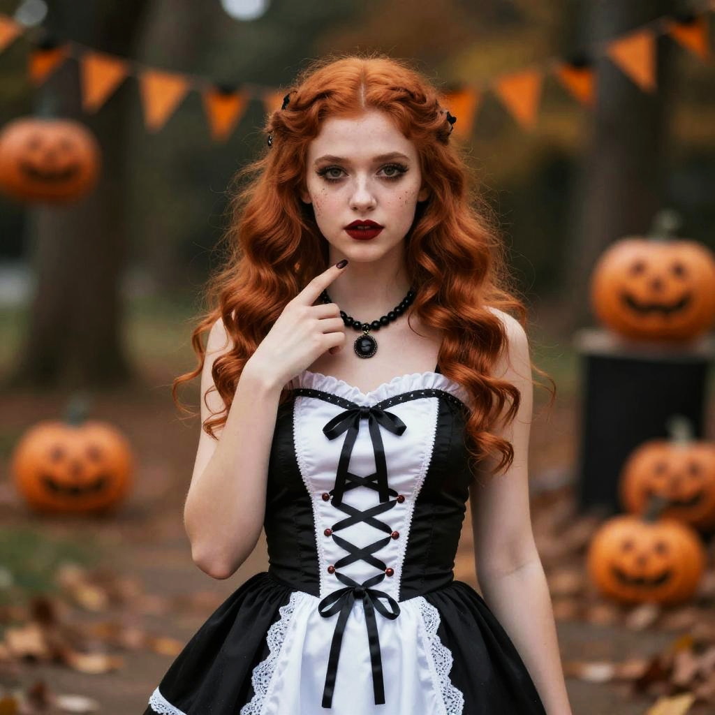 A redhead woman dressed in a black and white corset-style dress stands outdoors surrounded by Halloween pumpkin decorations. Her vintage-inspired look, complete with wavy hair and dark makeup, evokes a gothic or Victorian Halloween theme.