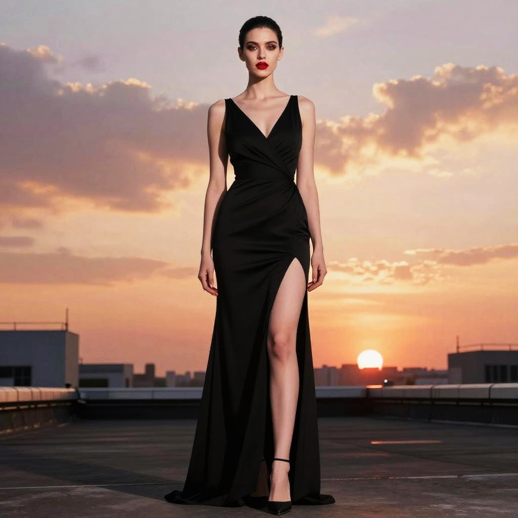A confident woman poses on a rooftop at sunset wearing a sleek black evening gown with a thigh-high slit. The elegant dress and dramatic lighting create a striking, sophisticated ambiance against the warm hues of the setting sun. Her bold red lipstick adds a touch of classic glamour to the fashionable scene.