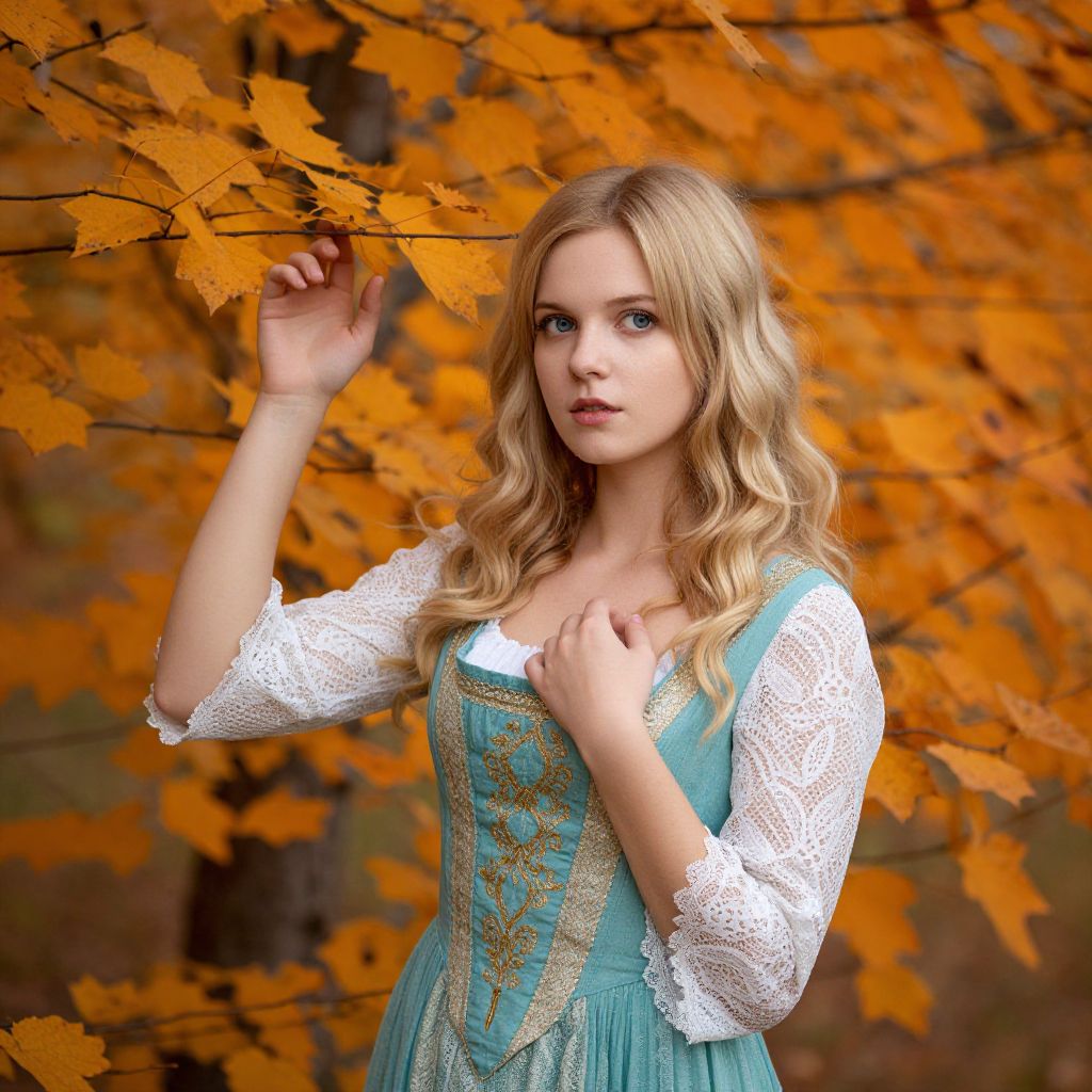 A young woman with long blonde hair poses gracefully among vibrant orange autumn leaves. She wears a vintage-style blue and white lace dress, evoking a romantic, fairytale-like atmosphere in a natural outdoor setting.