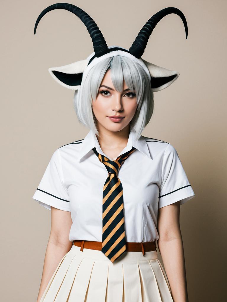 A woman dressed in a Kemono Friends-inspired Arabian Oryx cosplay features a detailed costume with gray hair, large curved horns, and animal ears. She wears a white school uniform shirt paired with a striped tie and a beige pleated skirt, embodying the distinct anime-style character design.