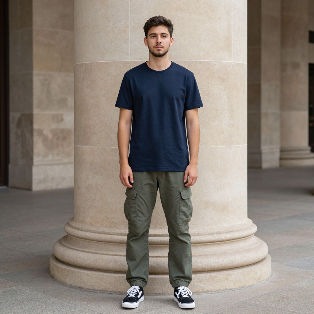 Young Man in Navy T-Shirt and Olive Cargo Pants Standing by Stone Column