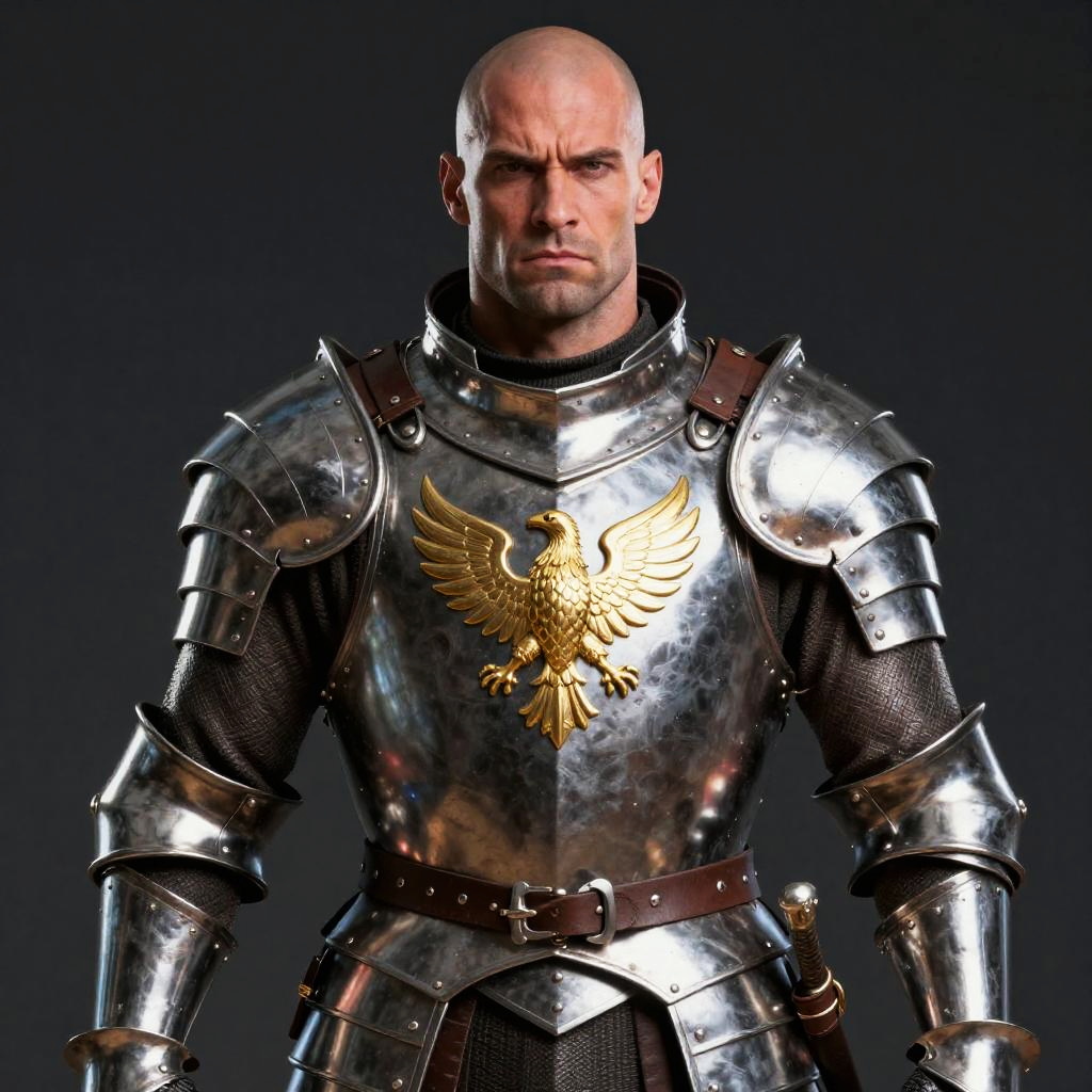 Man in Full Medieval Plate Armor with Golden Eagle Emblem