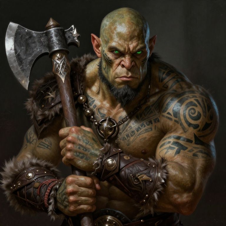 A fierce, muscular orc warrior grips a large battle axe, exuding strength and battle-readiness. His green glowing eyes, detailed tribal tattoos, and rugged fur-lined leather armor emphasize a fantasy warrior aesthetic, crafted in a highly realistic digital painting style.