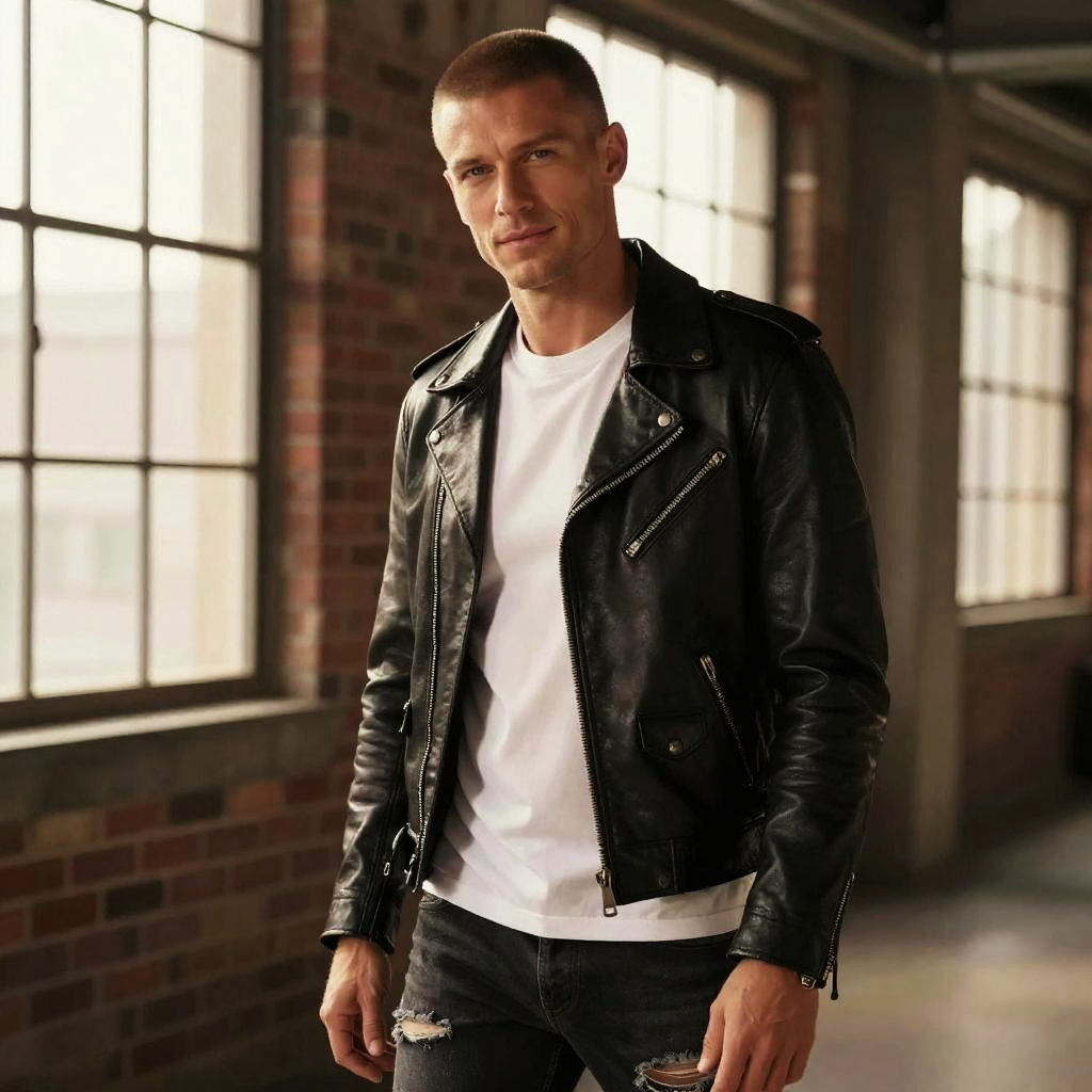 A confident young man poses indoors wearing a classic black leather biker jacket over a white t-shirt and distressed black jeans. The natural light from large industrial windows highlights the casual yet edgy style in this urban loft setting.