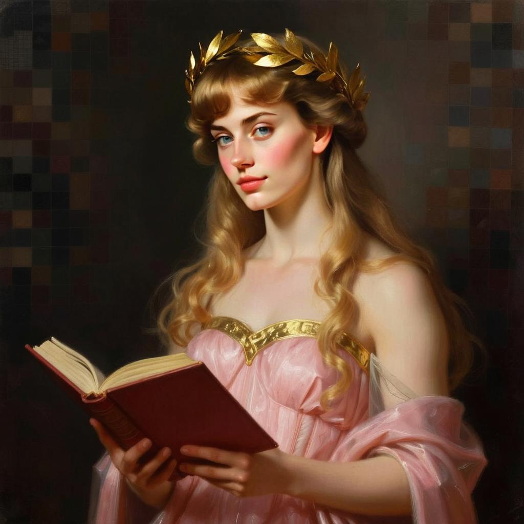 A young woman dressed in a classical, flowing pink gown with gold accents holds an open book in her hands. Her long, wavy blonde hair is adorned with a golden laurel wreath, and the soft lighting highlights her delicate features, evoking the style of classical oil portraiture.