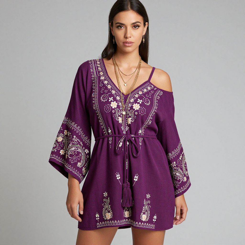 A confident woman models a stylish purple bohemian dress featuring floral embroidery and off-shoulder design with flowing sleeves. The dress is cinched at the waist with a matching tie belt, pairing elegance with a relaxed, trendy vibe.