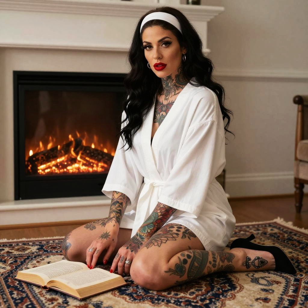 A tattooed woman with long black hair and bold red lipstick sits on a patterned rug in front of a cozy fireplace, dressed in a white robe and black high heels. She appears relaxed and contemplative as she poses with an open book on the floor, combining edgy body art with a warm, intimate indoor setting.