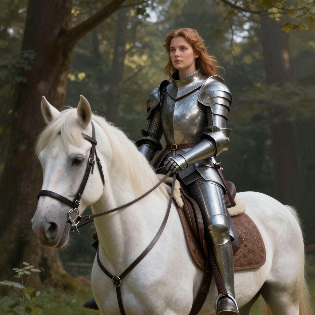 A woman clad in polished medieval armor sits confidently atop a majestic white horse in a serene forest setting. The image captures a blend of strength and elegance, emphasizing the timeless chivalric style of the armored knight.