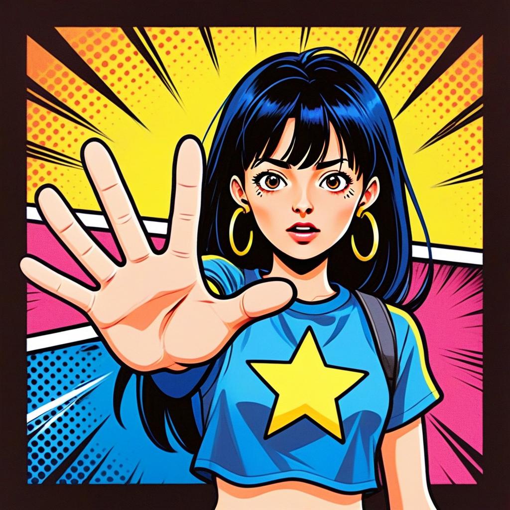 A vibrant pop art illustration of a young woman with long dark hair and large hoop earrings, wearing a blue crop top with a yellow star. She holds her hand forward in a stopping gesture against a dynamic comic-style background featuring bold halftone dots and radiant lines in yellow, pink, and blue. The composition combines retro comic book aesthetics with modern anime-inspired character design.