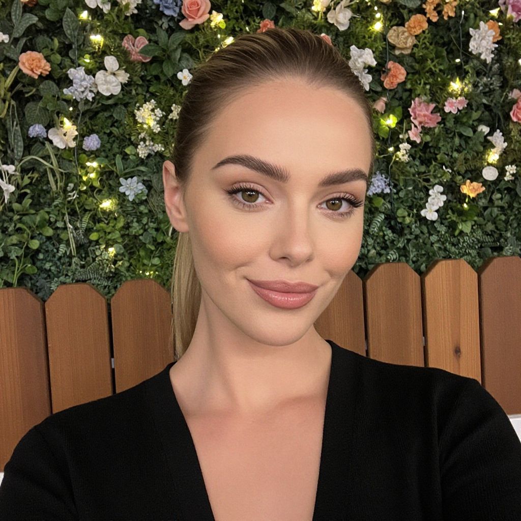 A young woman with flawlessly styled hair and natural makeup poses in front of a vibrant floral wall interspersed with small fairy lights. She wears a simple black top, exuding confidence and elegance in this well-lit, close-up portrait shot.