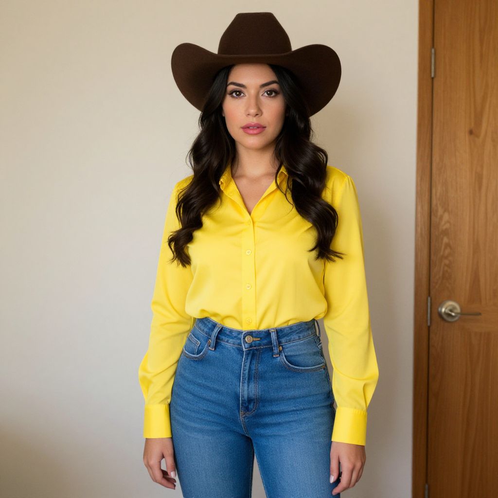 A confident woman wearing a bright yellow blouse and high-waisted blue jeans poses indoors against a neutral wall and wooden door backdrop. She completes her look with a dark brown wide-brimmed cowboy hat, blending modern fashion with western style influences.