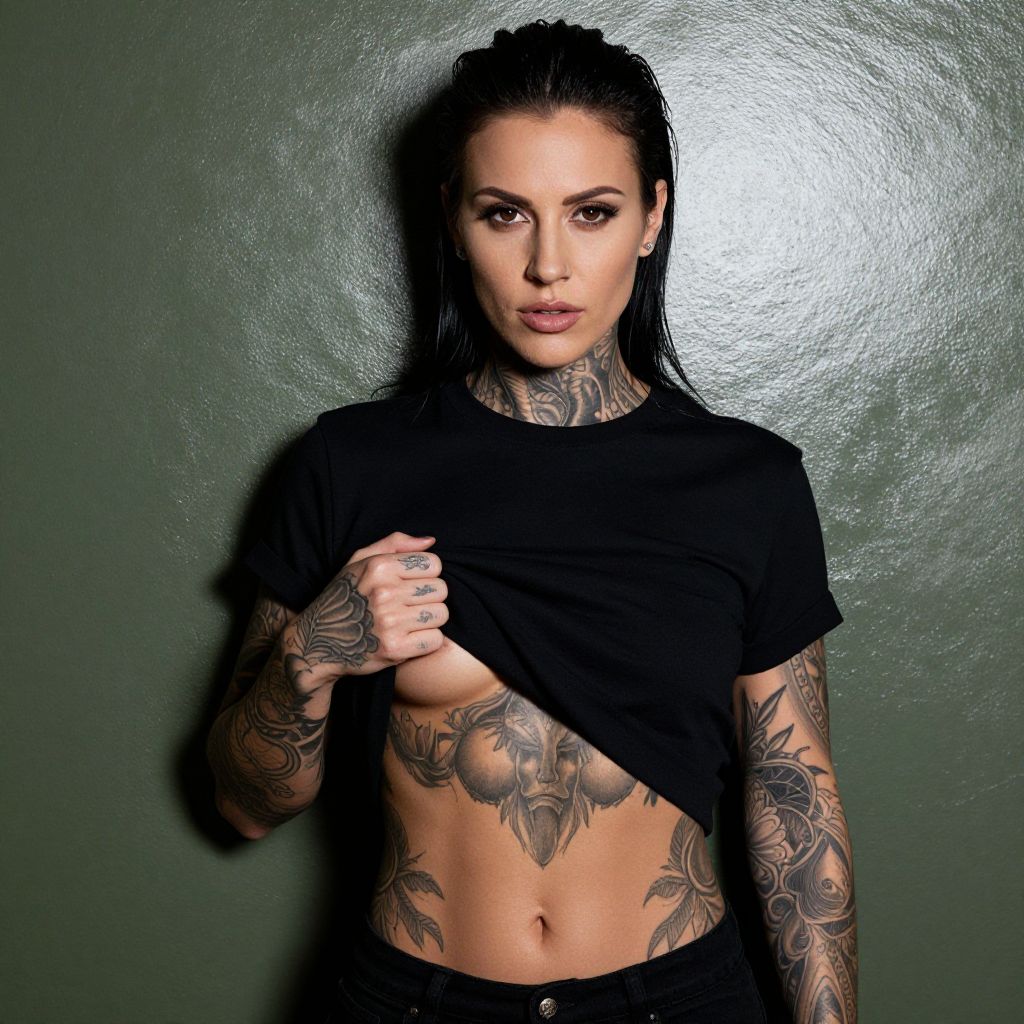 A confident woman with extensive and detailed tattoos on her arms, neck, and torso poses against a dark green textured wall. She lifts her black t-shirt to reveal intricate tattoo art on her stomach, exuding a bold and edgy style.