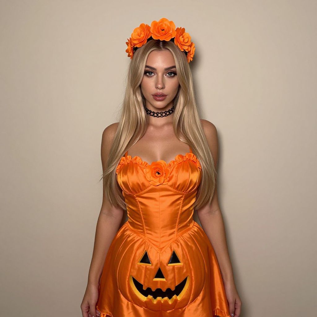 A woman poses in a vibrant orange satin dress designed with a Halloween pumpkin face on the skirt and floral accents on the bodice. She accessorizes with a matching orange flower crown and a black choker, set against a plain neutral background. The image highlights a festive, playful Halloween costume style with a modern, glamorous touch.