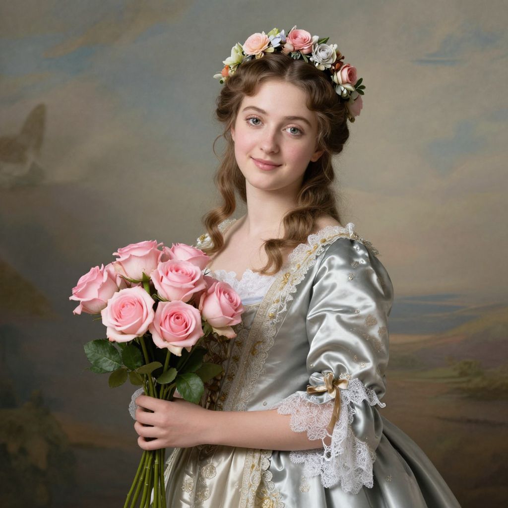 A young woman dressed in an elegant, vintage satin gown adorned with lace and delicate embroidery holds a bouquet of soft pink roses. She wears a floral crown and poses against a muted, classic painted backdrop, evoking the style of 18th-century portraiture with a serene and graceful expression.