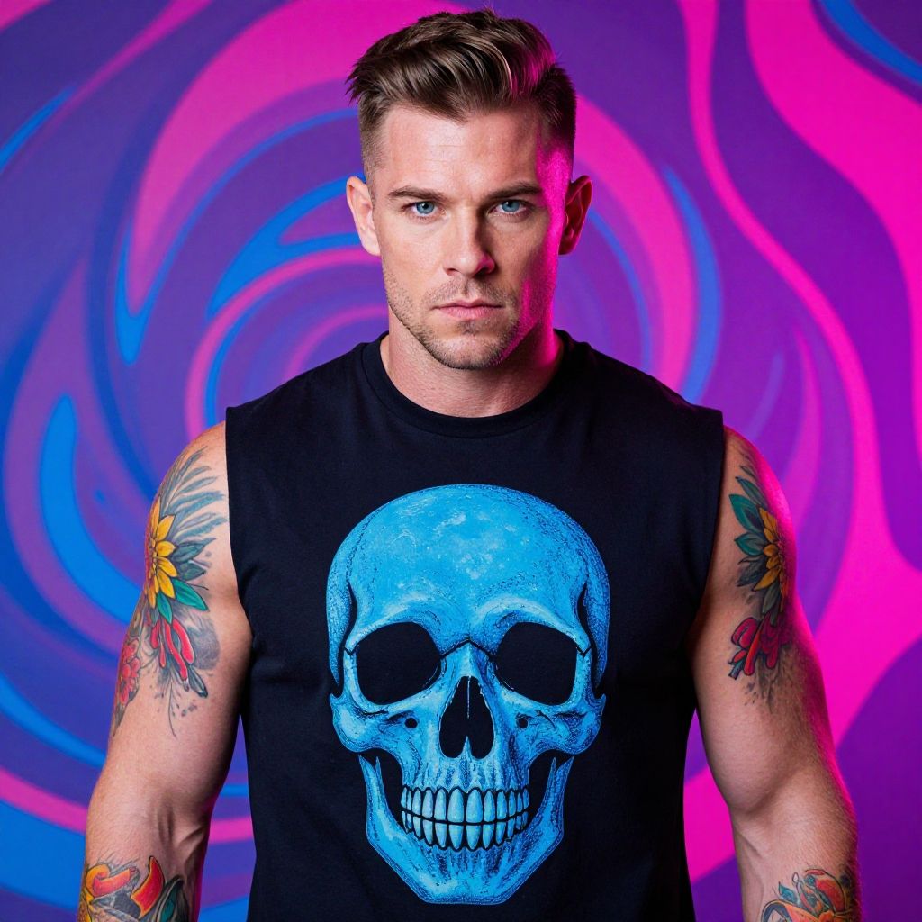 A muscular man with blue eyes stands confidently against a vivid purple and blue swirling background. He wears a black sleeveless shirt featuring a large blue skull graphic, showcasing vibrant floral tattoos on both arms. The image captures a bold modern style with neon lighting effects that emphasize his intense expression.