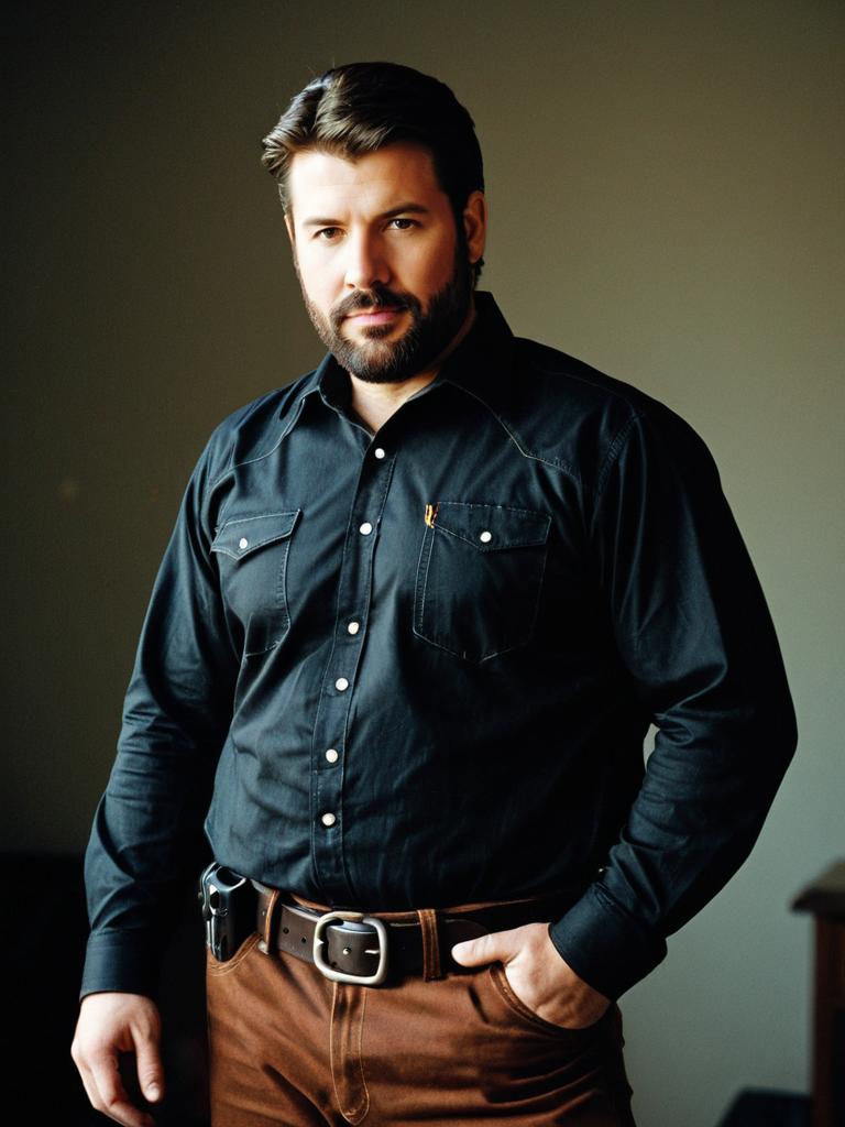 A confident man wearing a black button-up shirt and brown pants stands with one hand in his pocket against a neutral background. His facial hair and casual yet polished clothing style suggest a rugged, modern look. The image focuses on the man's upper body, highlighting his serious expression and stylish attire.
