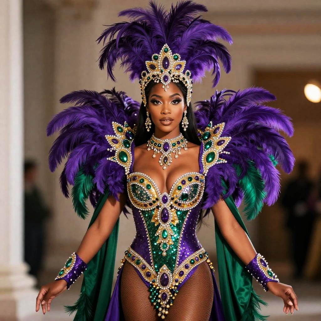 Woman in Vibrant Purple and Green Feathered Carnival Costume with Jewels