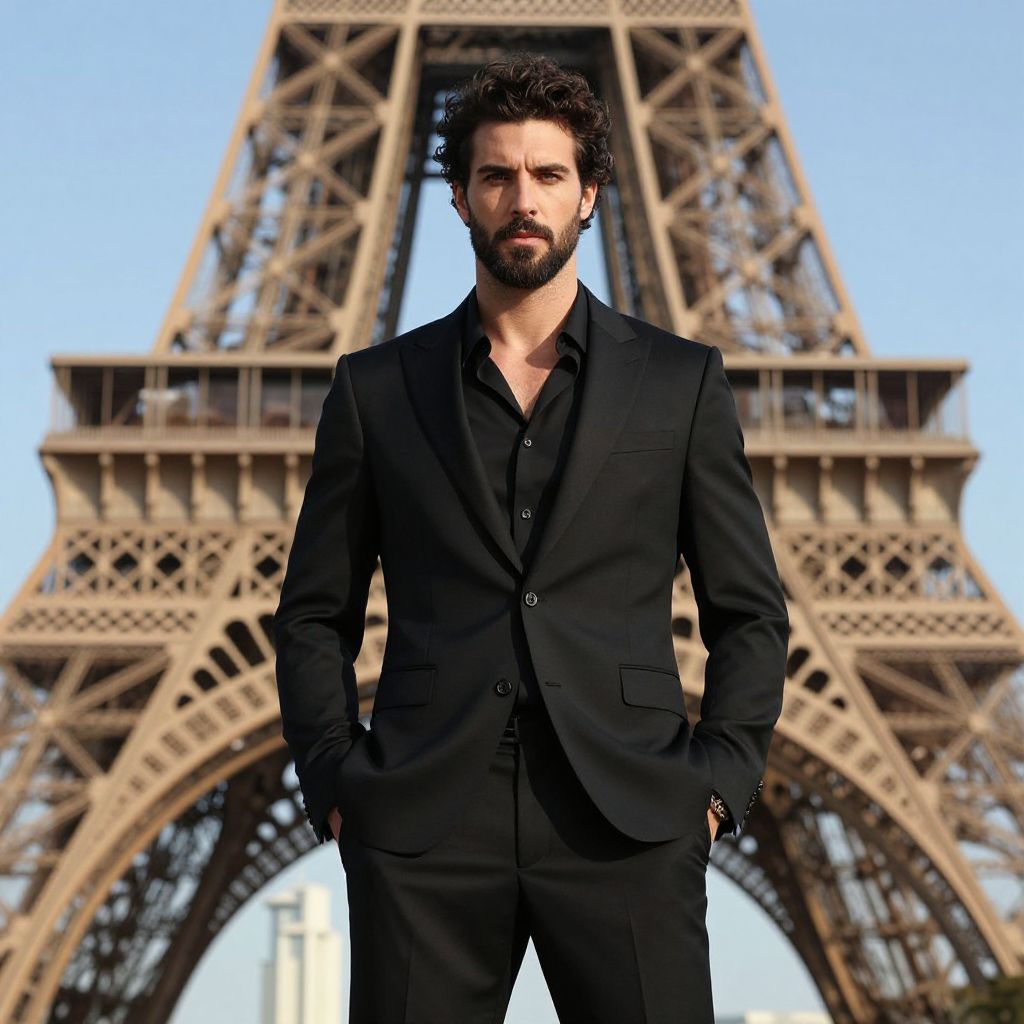 A confident man in a sleek black suit poses with his hands in his pockets in front of the iconic Eiffel Tower. The sharp focus on the man against the softly blurred background highlights his stylish appearance in a classic urban setting.