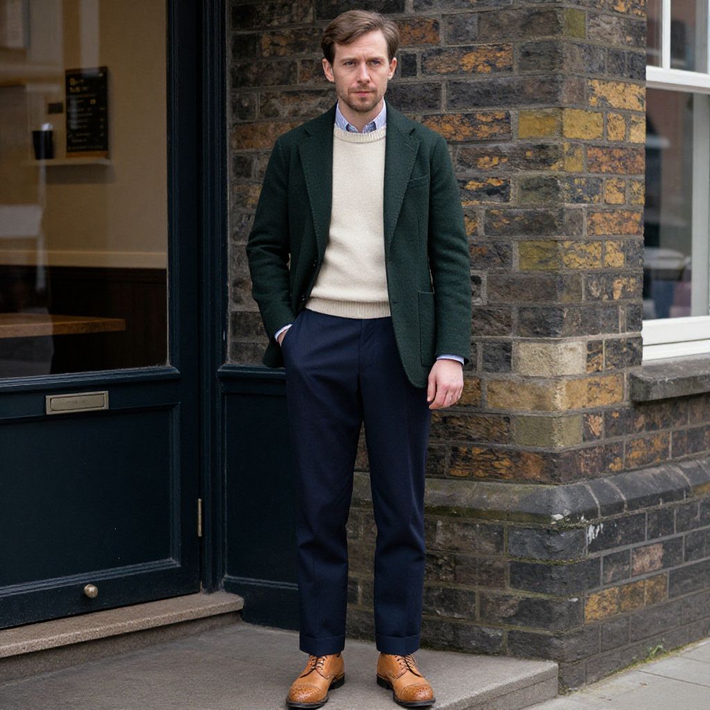 A man stands confidently outside a building with a brick facade, wearing a smart casual outfit featuring a dark green blazer, cream sweater, navy trousers, and brown leather brogue shoes. The image captures a stylish and modern urban look with classic tailoring elements.