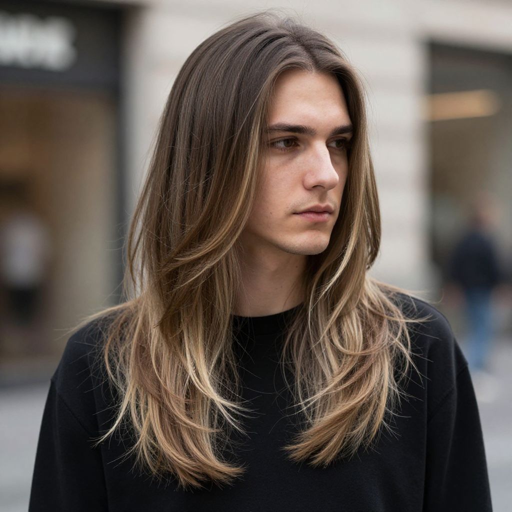 A young man with long, layered, light brown hair and subtle blonde highlights stands outdoors in an urban setting, looking pensively to the side. He wears a simple black shirt, and the soft natural lighting accentuates the smooth texture and volume of his hairstyle.