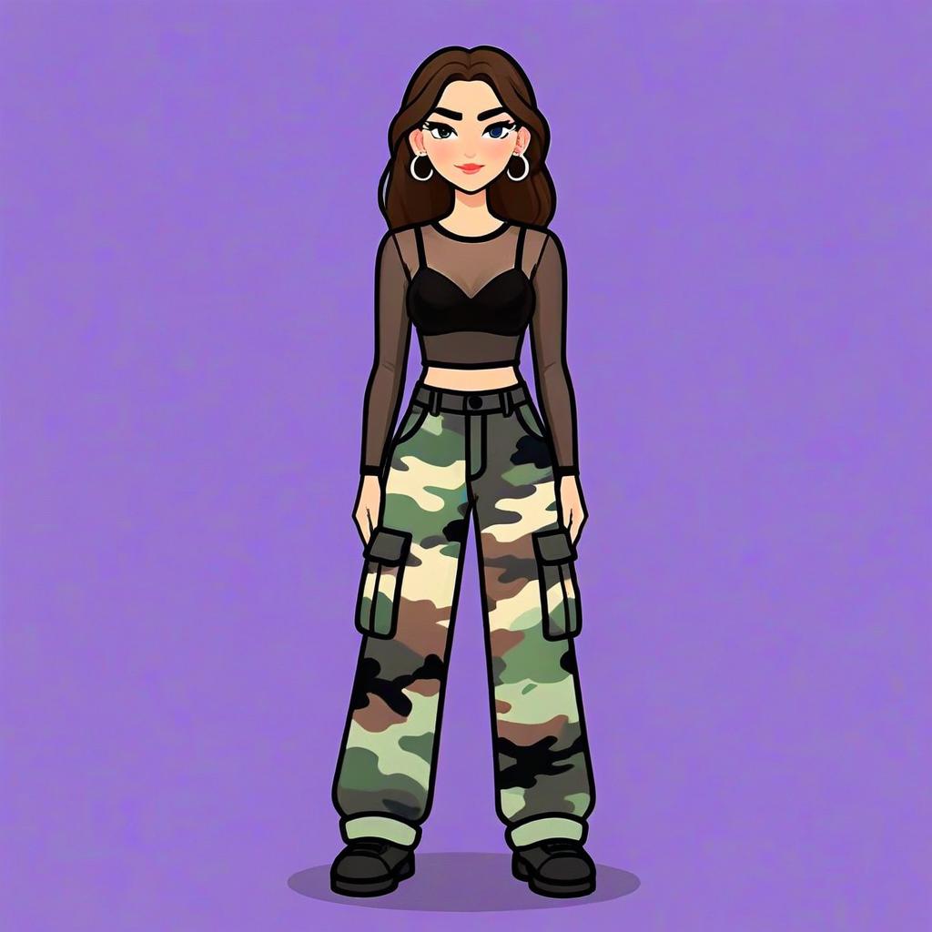 Urban Streetwear Woman with Camouflage Cargo Pants and Sheer Black Top Illustration