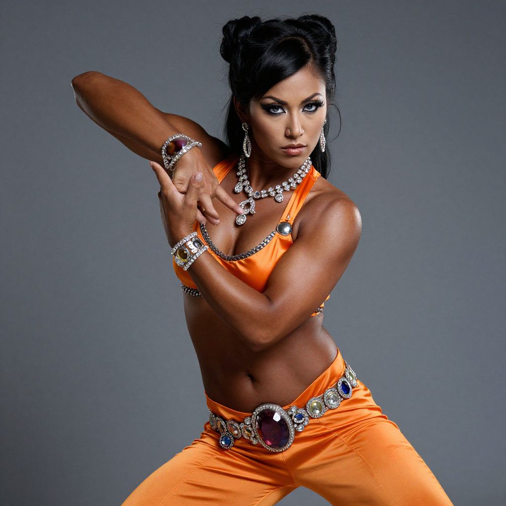 A confident woman strikes a dynamic pose wearing a vibrant orange costume adorned with large gemstone jewelry. The image highlights her muscular physique and intense gaze, combining elements of dance and performance art with a modern, glamorous style.