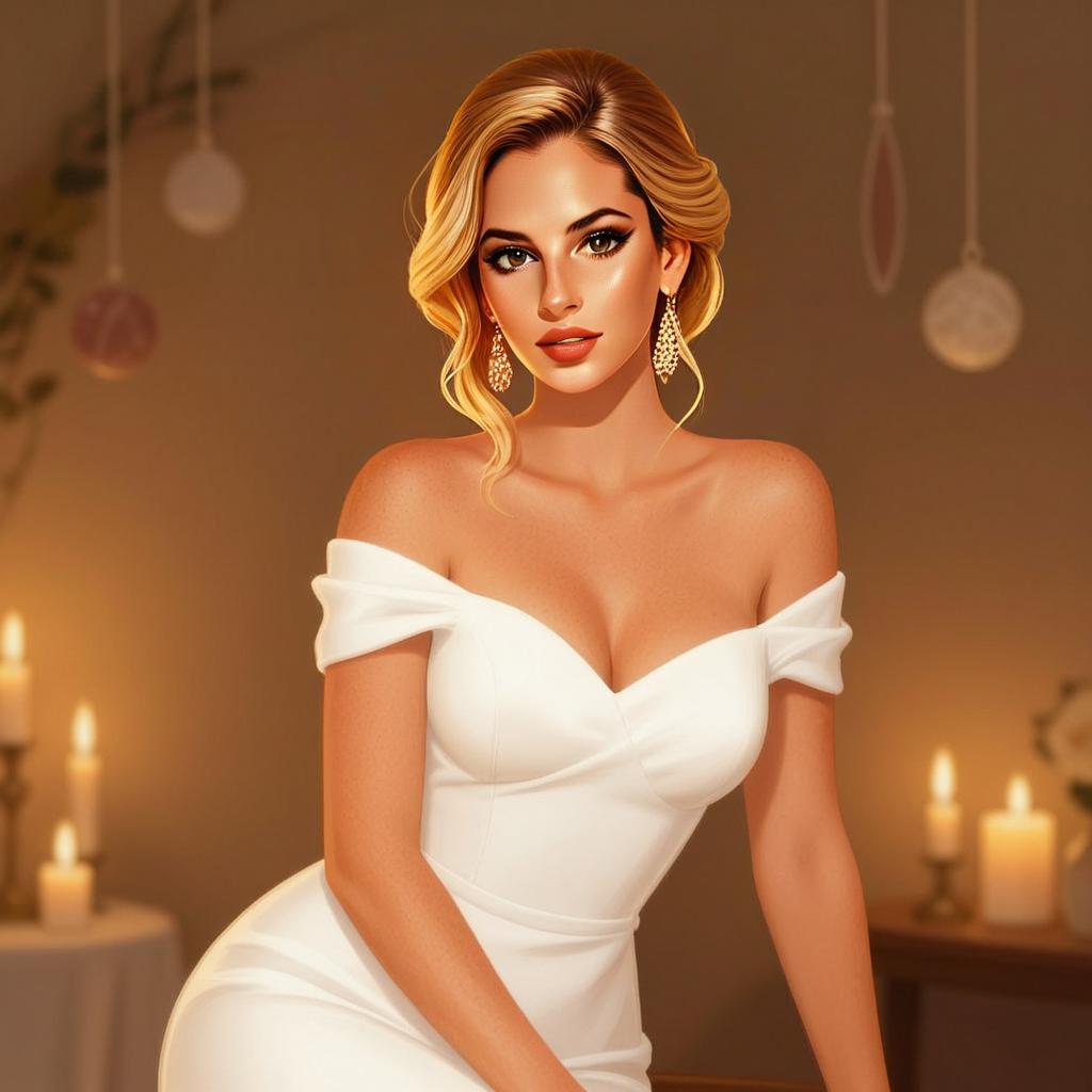 A glamorous woman with blonde hair styled in soft waves, wearing a sophisticated off-shoulder white dress. The elegant setting is softly lit by numerous candles, enhancing the warm and intimate atmosphere. This digitally enhanced portrait combines realism with a smooth, polished art style.