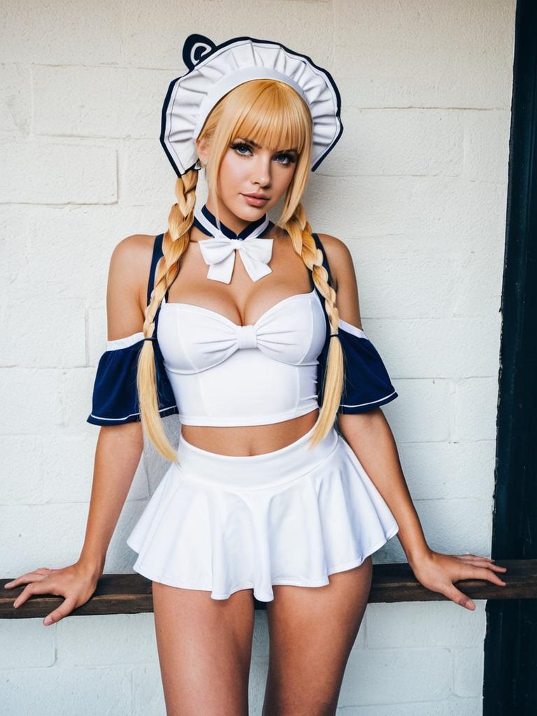 A woman cosplaying as Abigail Williams from the Fate series dressed in a stylish maid-inspired swimsuit. The costume features a white and navy blue color scheme with braided blonde hair, a ruffled headpiece, and a flared skirt, combining elements of classic maid aesthetics with modern swimwear design.