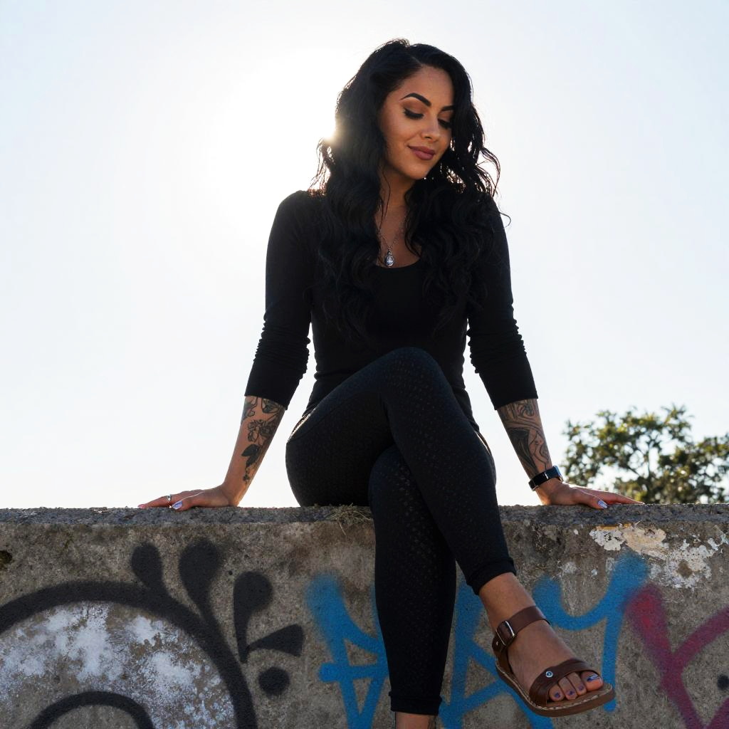 A stylish woman with long curly hair and tattoos sits gracefully on a graffiti-covered concrete wall, backlit by the bright sun creating a soft halo effect. She wears an all-black outfit with comfortable sandals, exuding a confident and relaxed urban vibe.