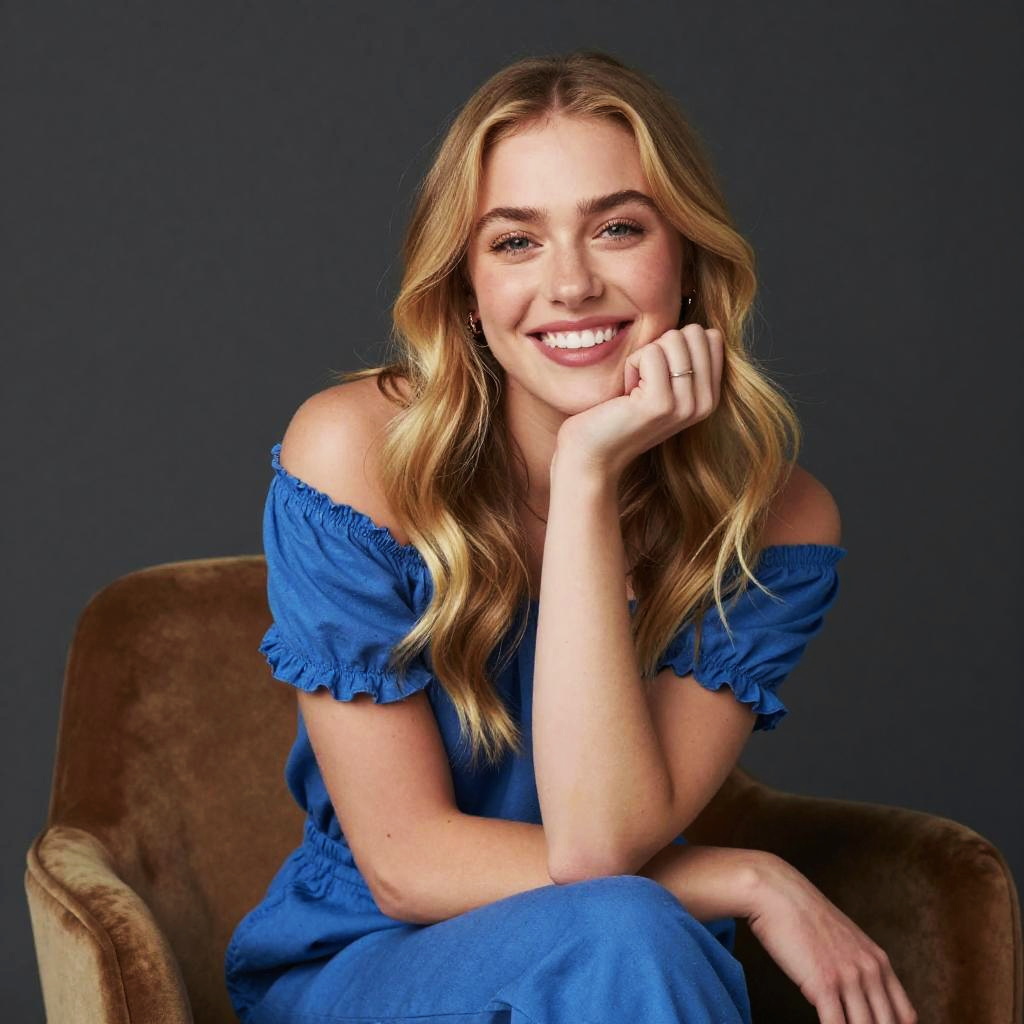 A young woman with blonde hair and a bright smile sits comfortably in a plush brown chair against a dark grey backdrop. She is dressed in a casual, off-shoulder blue dress, emanating a relaxed and approachable vibe perfect for lifestyle or portrait photography.