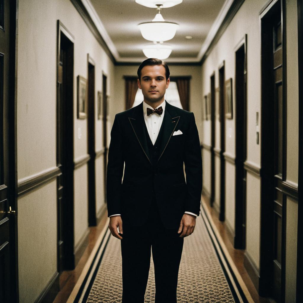 A man dressed in a classic black suit with a bow tie stands confidently in a well-lit hallway, evoking the sophisticated style reminiscent of the Gatsby era. The elegant setting and his poised stance suggest a formal, vintage-inspired atmosphere.