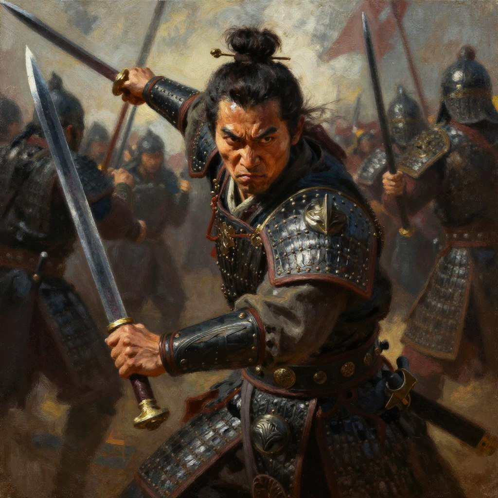 Fierce Samurai Warrior in Battle with Katana and Traditional Armor