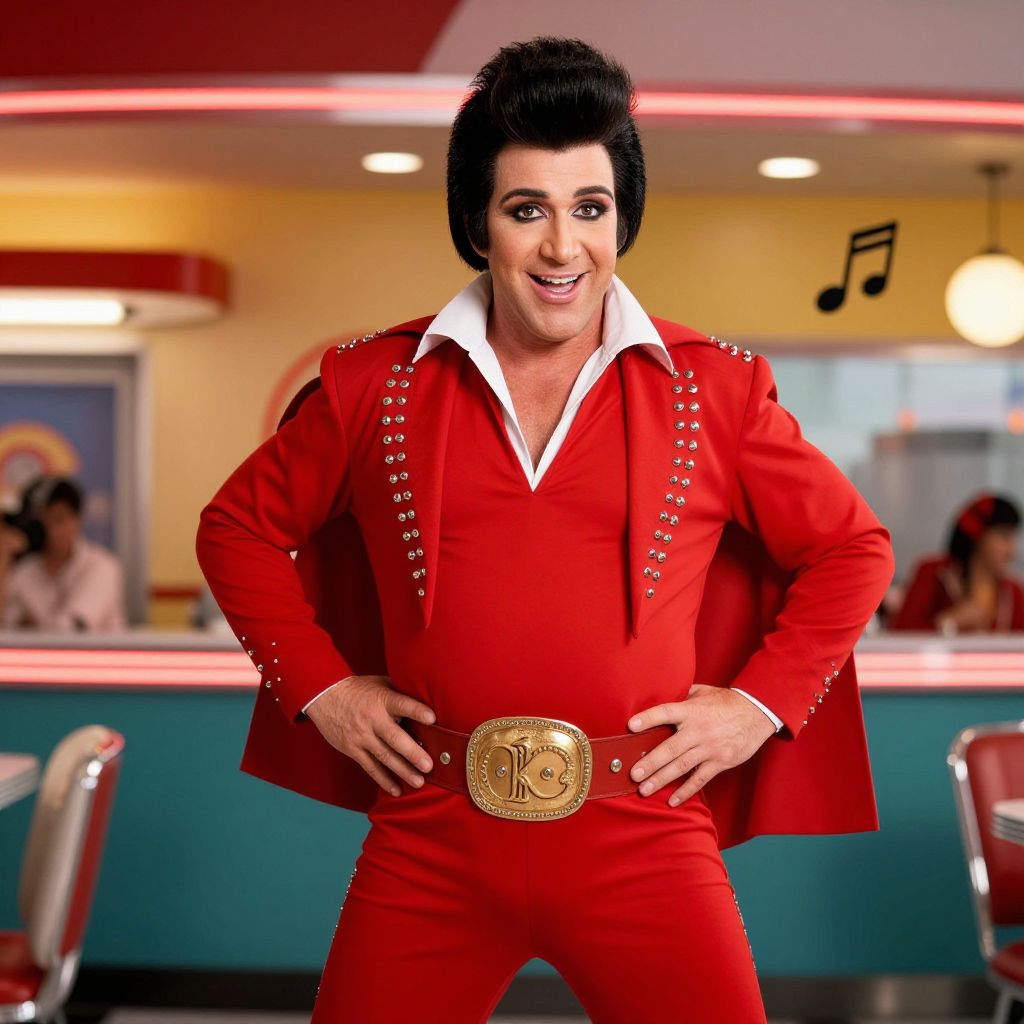 A man dressed in a vibrant red retro jumpsuit stands confidently in a colorful diner setting, reminiscent of 1950s rock 'n' roll style. His outfit features studded details, a wide collar, and a large gold belt buckle, complementing his voluminous hairstyle and theatrical makeup. The scene captures a lively, nostalgic vibe with musical notes subtly decorating the background.