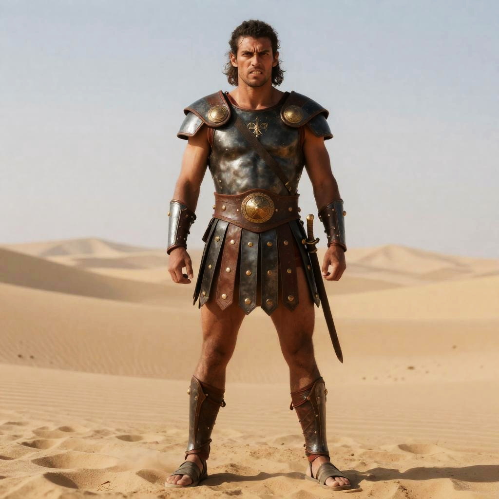 A man dressed as an ancient warrior stands confidently in a vast desert landscape, wearing classical bronze armor with a leather kilt and arm guards. His intense expression and muscular build emphasize a heroic and historical vibe, evoking imagery from Greek or Roman times.