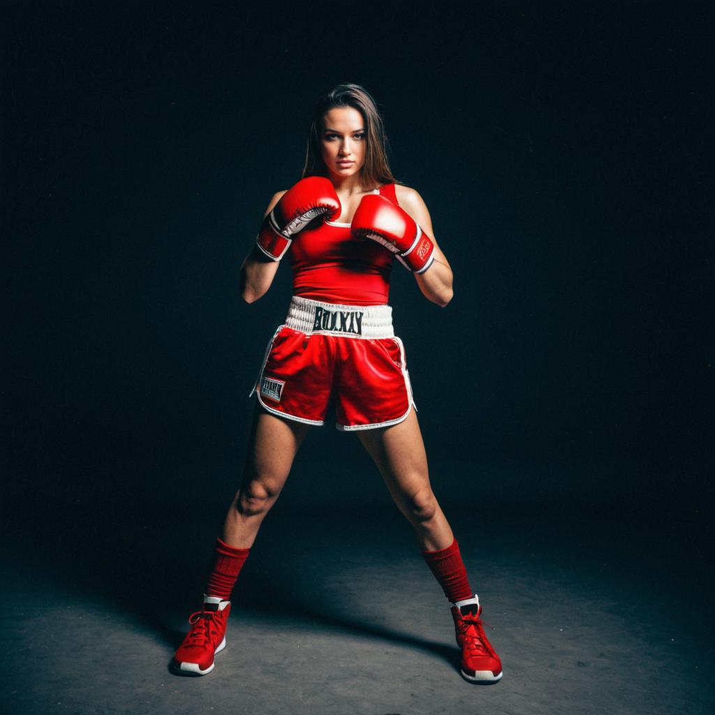 A determined woman poses confidently in a red boxing outfit, complete with gloves, shorts, and sneakers, against a dark background. Her stance and focused expression highlight strength and readiness, embodying the spirit of boxing.