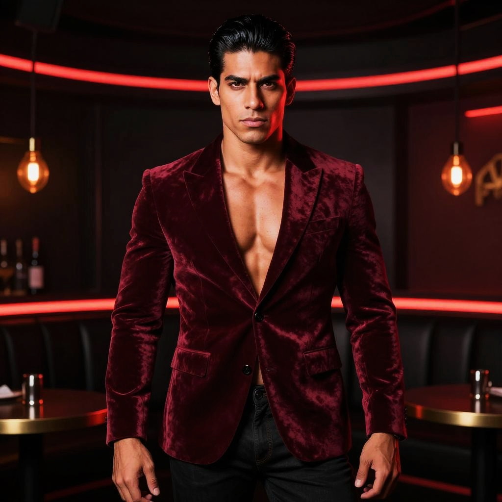 A confident young man stands in a stylish modern bar, wearing a deep red velvet blazer without a shirt underneath, exuding bold fashion and sophistication. The moody lighting with warm red neon accents enhances the sleek and contemporary atmosphere.