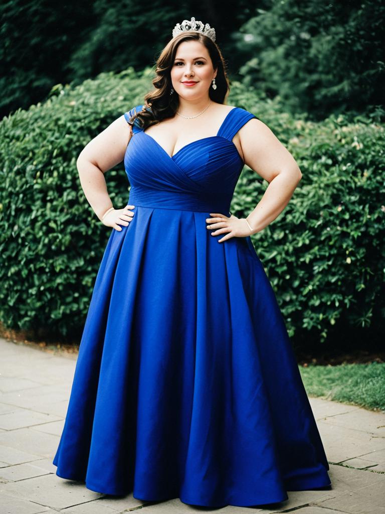 A confident plus-size woman poses outdoors in a royal blue dress designed for weddings. The elegant gown features a fitted bodice with wide straps and a flowing skirt, complemented by a delicate tiara and matching jewelry for a regal look.